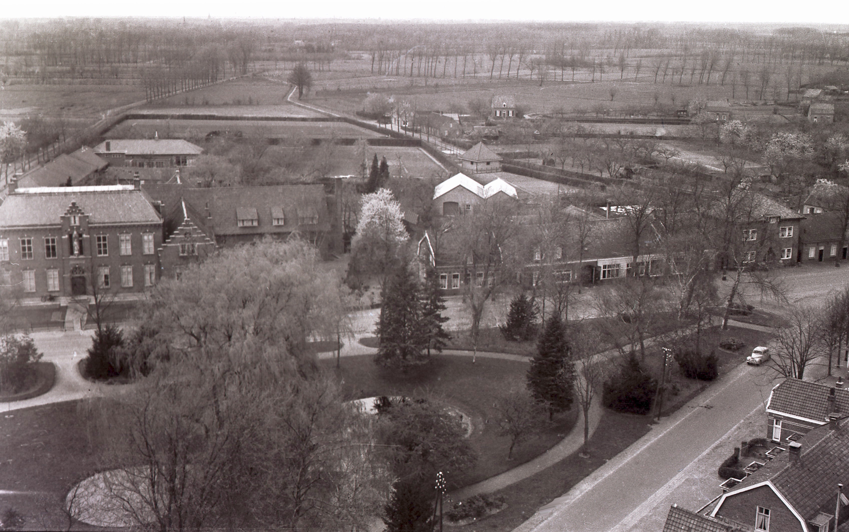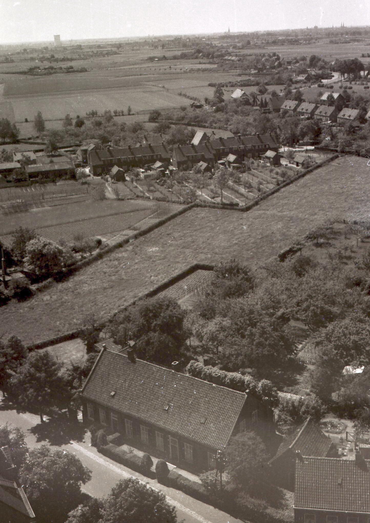daarachter de school en aan de rechterkant het ziekenhuis (gebouwd 1938). Verder een mooi weids