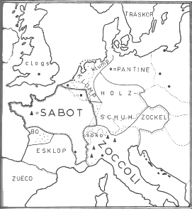 Centraal staat het gebied van sabot "klomp". De periferie heeft zueco "klomp, overschoen",