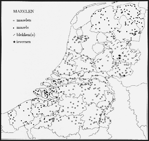 1. Uit wat Van Loey (1966, p. 13) in zijn gebruikelijke gecondenseerde proza meedeelt: `Een meervoud op -s hebben: 1. woorden op -el, -en, -er...... Het komt voornamelijk in Westvl. en Holl. documenten, reeds in de 13de e., voor en bij groep 1 (dat is die op -el, enz. J.S.) eerst laat en zelden (vnl. Brab. en Holl.).' valt op te maken dat het -s-meervoud bij woorden als vogel pas tegen het einde van de 15e eeuw (daar eindigt zijn onderzoeksperiode) en dan nog maar sporadisch en dan nog vooral in Brabant en Holland voorkomt. Dat zou betekenen dat de kaart mazelen de situatie tot in elk geval 1500 toont. Terug