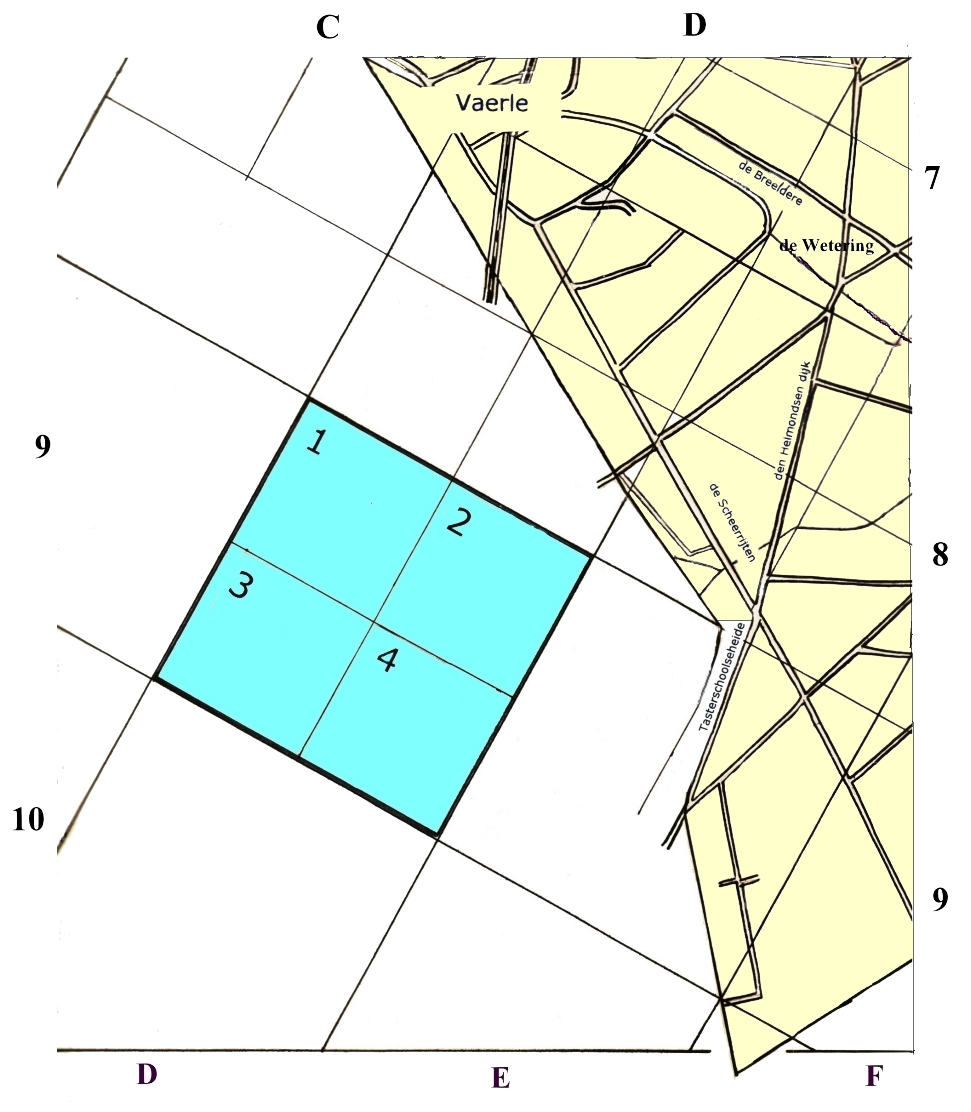 1000 bij 1000 meter. Elk van deze vlakken is weer verdeeld in vieren. De vier deelvlakken