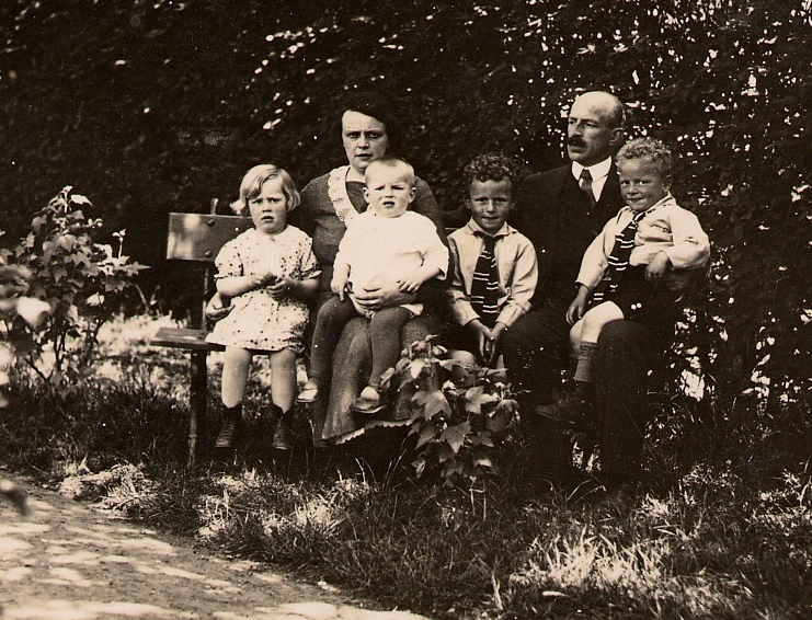 op de bank poseren met vader en moeder, vormt de heg van Trienekes tuin de achtergrond. De foto is genomen op een