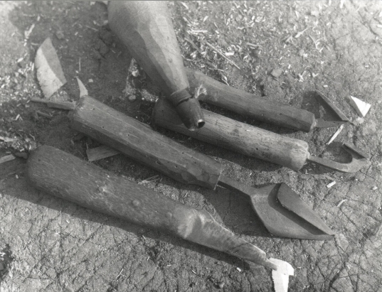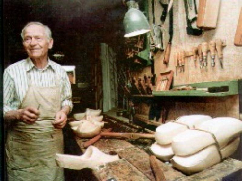 De Klomperij in LitouwenOver de klomperij in Litouwen, zoals die zich manifesteert uit de gegevens van Jurate Skrebyte waarop Jan Michael Rynning mij heeft geattendeerd - die te vinden zijn op deze Litouwse website maar die ook op op onze eigen site staan - heb ik mij van meet af aan ten zeerste verbaasd. Ter verklaring moet ik de lezer uitnodigen de hier afgebeelde foto met klompenmaker J. Paulauskas even in detail te bezien.![]() De eerste vaststelling is dat het inderdaad gaat om gewone holle klompen. Ze zijn niet al te fraai van vorm en ze worden - zie rechts vooraan - op een voor ons onorthodoxe wijze tot paren samengebonden, maar ze zijn hol en hebben een mooie, grote schulp. Vooal het exemplaar dat in z'n eentje prominent vastgeklemd staat in een of andere werkbank laat de kwaliteit van de vorm duidelijk zien. Die werkbank is, voor zover ze niet atypisch is, volkomen vreemd in vergelijking met alles wat we aan werkbanken waar dan ook hebben aangetroffen. Hoewel de positie van de klomp de gedachte wekt dat in de getoonde situatie de uitholling plaats heeft, is er geen sprake van een heulbank. In dit opzicht kunnen we zeggen dat de inrichting van de werkplaats enigszins primitief is. Het gereedschap dat we te zien krijgen op de foto is een povere collectie. Eigenlijk zien we alleen een soort van avegaar met een dwars geplaatst handvat of kruk. Wat de klompenmaker in de hand heeft laat geen duiding toe en verder zien we aan de wand een grote reeks kleine instrumenten die niets anders kunnen zijn dan mesjes voor het aanbrengen van versieringen: ritsmesjes, denk ik, en knopendraaiers. Ook dit zijn zaken die we van nergens anders kennen dan uit de brabantse Meierij (vergelijk de foto uit Nederwetten). Verder zien we geen gereedschap, behalve opgehangen aan de wand: een paalmes. Het heeft een zwaar houten handvat, geplaatst in de lengterichting van het mes, waarvan naar boven toe alleen onzichtbaar blijft het deel met de gekrulde haak - die gesmede krul waarmee het mes onder de kram op het blok of de paal (blokmes, paalmes, krammes) wordt vastgehaakt. Er zijn twee redenen om hierbij aan een paalmes te denken eerder dan aan een bodemmes (waarmee de uitholling van de klomp wordt afgewerkt): de lichte knik in het mes vlak boven het handvat en het feit dat een instrument niet kan worden opgehangen aan een snijblad en wel aan een gesmede krul. De conclusie moet zijn dat de Litouwse klomperij niet past in het verspreidingspatroon van gereedschappen en technieken dat we inmiddels hebben kunnen waarnemen van de Spaanse grens tot in Denemerken en Zweden. Het is niet gewaagd te veronderstellen dat de klomperij op andere wijze dan door grotendeels willekeurige ontwikkeling en verspreiding in Litouwen is terechtgekomen. Jurate Skrebyte zegt : It was a French and the Swiss who brought clogs to Lithuania at the end of the 18th century. Het lijkt de vermelding van een welbekend historisch feit en suggereert dat het een gebeurtenis was die berustte op een weloverwogen initiatief, iets heel anders dus dan de bekende wijze waarop volksgebruiken en -technieken hun geografische verspreiding vonden. Rynning, die zich ook bezighield met de kwestie, onderscheidt die tradtionele wijze van verspreiden van een andere, die hij karakteriseert als migratie en beschrijft als volgt: